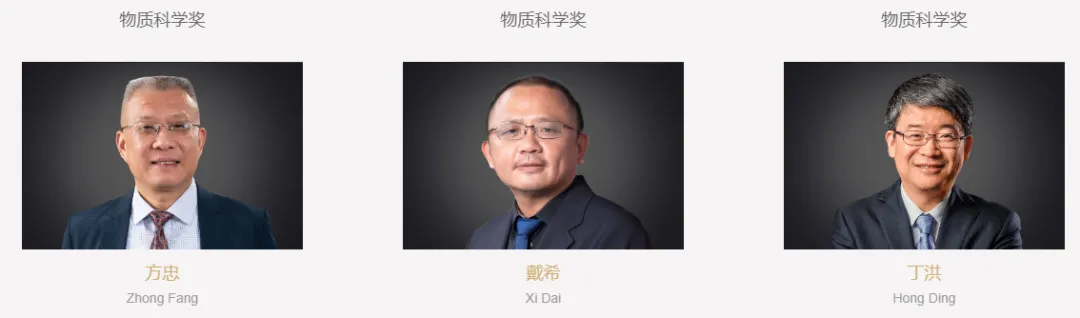 “物質(zhì)科學(xué)獎(jiǎng)”獲獎(jiǎng)?wù)叻街?、戴希、丁洪,表彰他們?cè)谕負(fù)潆娮硬牧系挠?jì)算預(yù)測(cè)以及實(shí)驗(yàn)實(shí)現(xiàn)方面做出的貢獻(xiàn)。