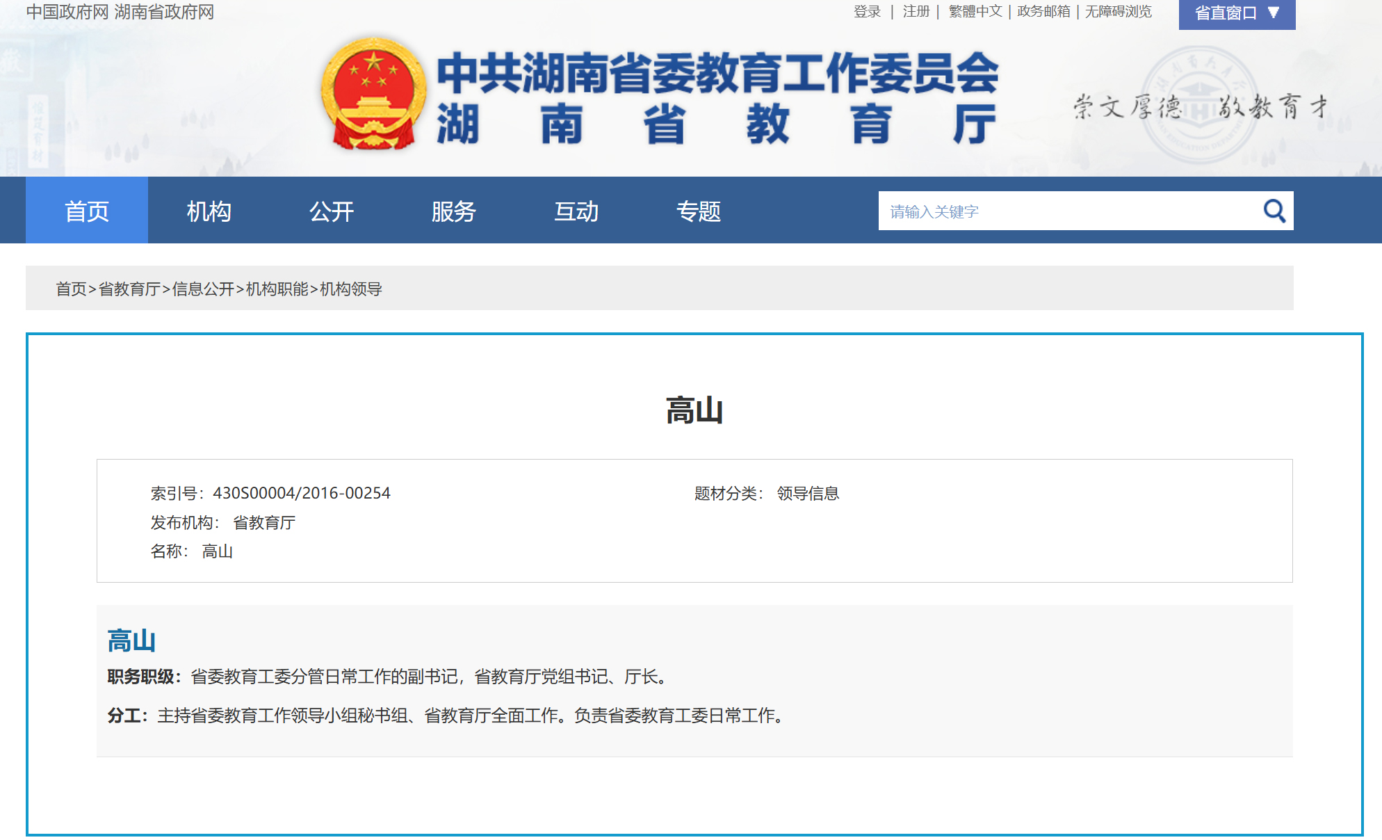 湖南省教育廳官網(wǎng)日前更新顯示,高山已任省委教育工委分管日常工作的副書記,省教育廳黨組書記、廳長。主持省委教育工作領(lǐng)導(dǎo)小組秘書組、省教育廳全面工作。負(fù)責(zé)省委教育工委日常工作。