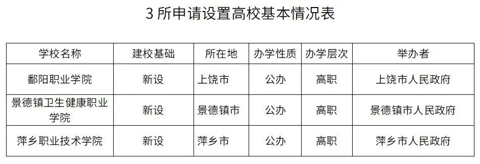 公示內(nèi)容顯示,擬新設(shè)的鄱陽職業(yè)學(xué)院、景德鎮(zhèn)衛(wèi)生健康職業(yè)學(xué)院、萍鄉(xiāng)職業(yè)技術(shù)學(xué)院均為公辦性質(zhì)的高職院校,分別位于江西省的上饒市、景德鎮(zhèn)市和萍鄉(xiāng)市。