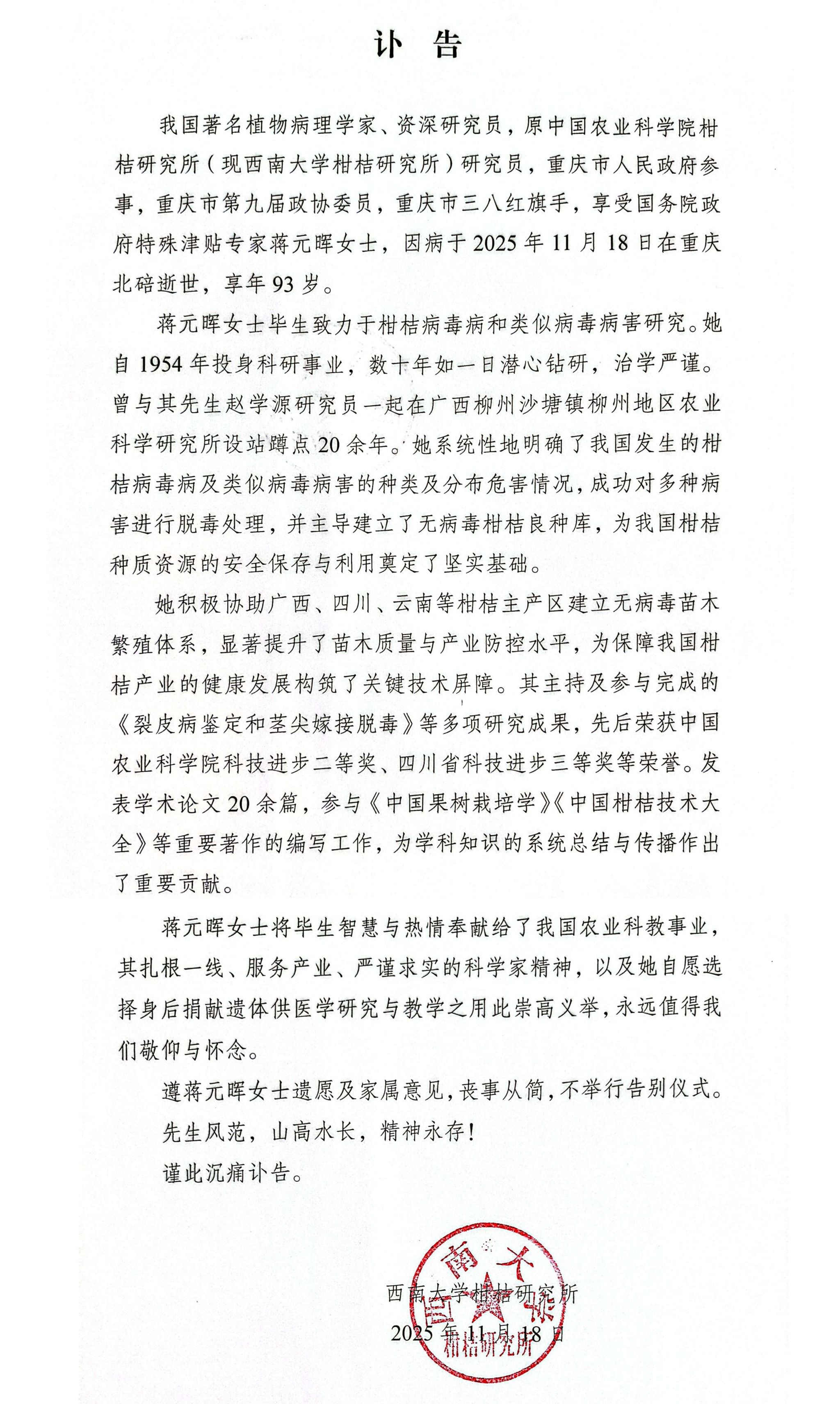 11月18日,西南大學(xué)柑桔研究所發(fā)布訃告:我國(guó)著名植物病理學(xué)家、資深研究員,原中國(guó)農(nóng)業(yè)科學(xué)院柑桔研究所(現(xiàn)西南大學(xué)柑桔研究所)研究員,重慶市人民政府參事,重慶市第九屆政協(xié)委員,重慶市三八紅旗手,享受國(guó)務(wù)院政府特殊津貼專家蔣元暉女士,因病于2025年11月18日在重慶北碚逝世,享年93歲。