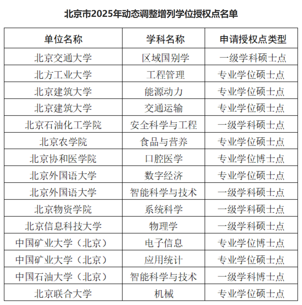 近日,經(jīng)北京市學(xué)位委員會委員會議審議,通過了2025年動態(tài)調(diào)整增列的碩士學(xué)位授權(quán)點名單。目前名單正在進行公示,公示期為10個工作日(2025年12月5日至12月14日)。