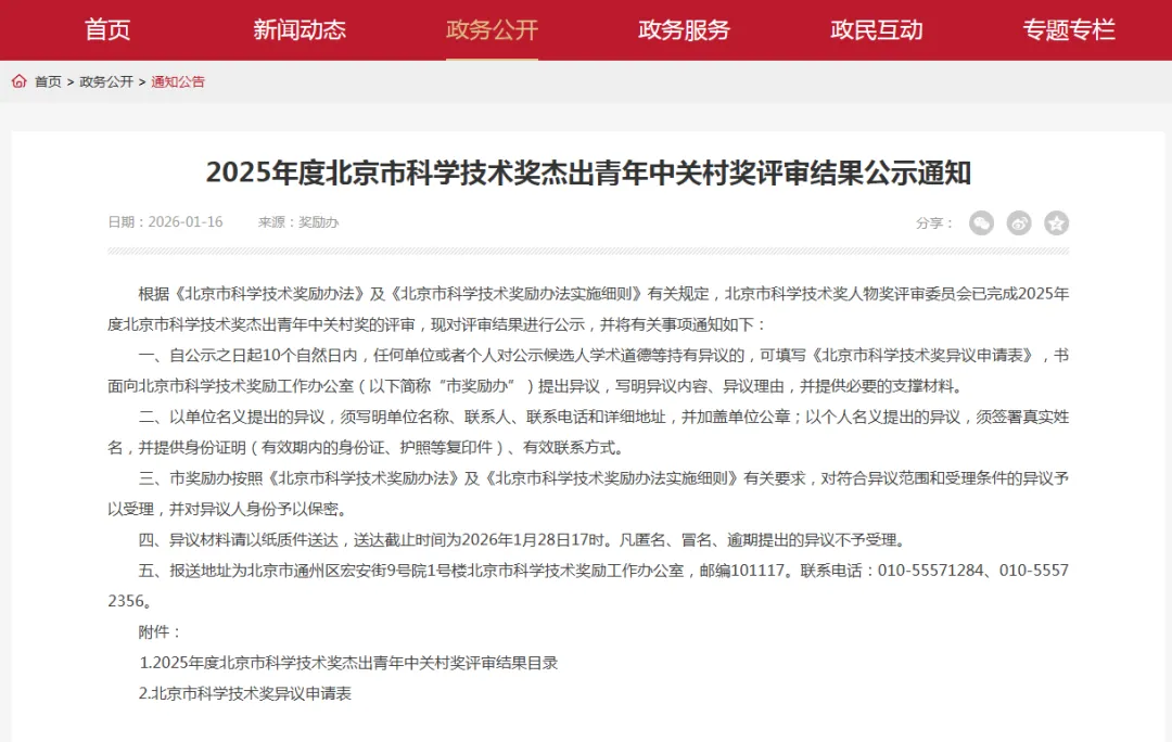 日前,北京市科學技術(shù)委員會、中關(guān)村科技園區(qū)管理委員會官網(wǎng)發(fā)布了《2025年度北京市科學技術(shù)獎杰出青年中關(guān)村獎評審結(jié)果公示通知》。