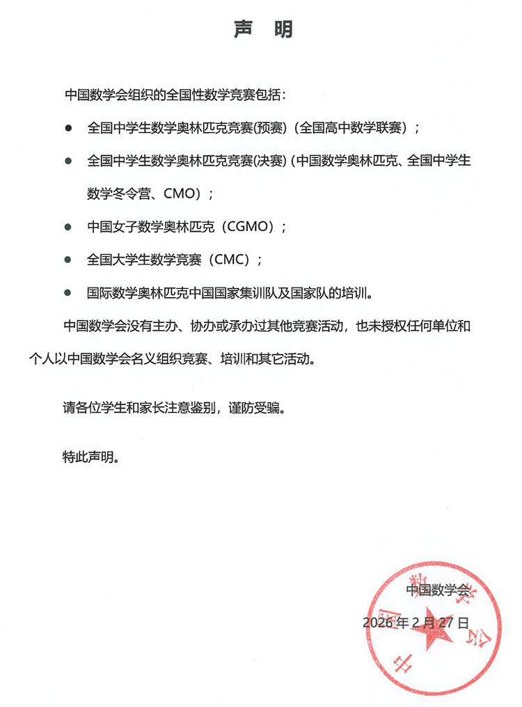 中國數(shù)學(xué)會2月27日發(fā)布聲明,明確除5項全國性數(shù)學(xué)競賽外,中國數(shù)學(xué)會沒有主辦、協(xié)辦或承辦過其他競賽活動,也未授權(quán)任何單位和個人以中國數(shù)學(xué)會名義組織競賽、培訓(xùn)和其它活動。提醒學(xué)生和家長注意鑒別,謹(jǐn)防受騙。