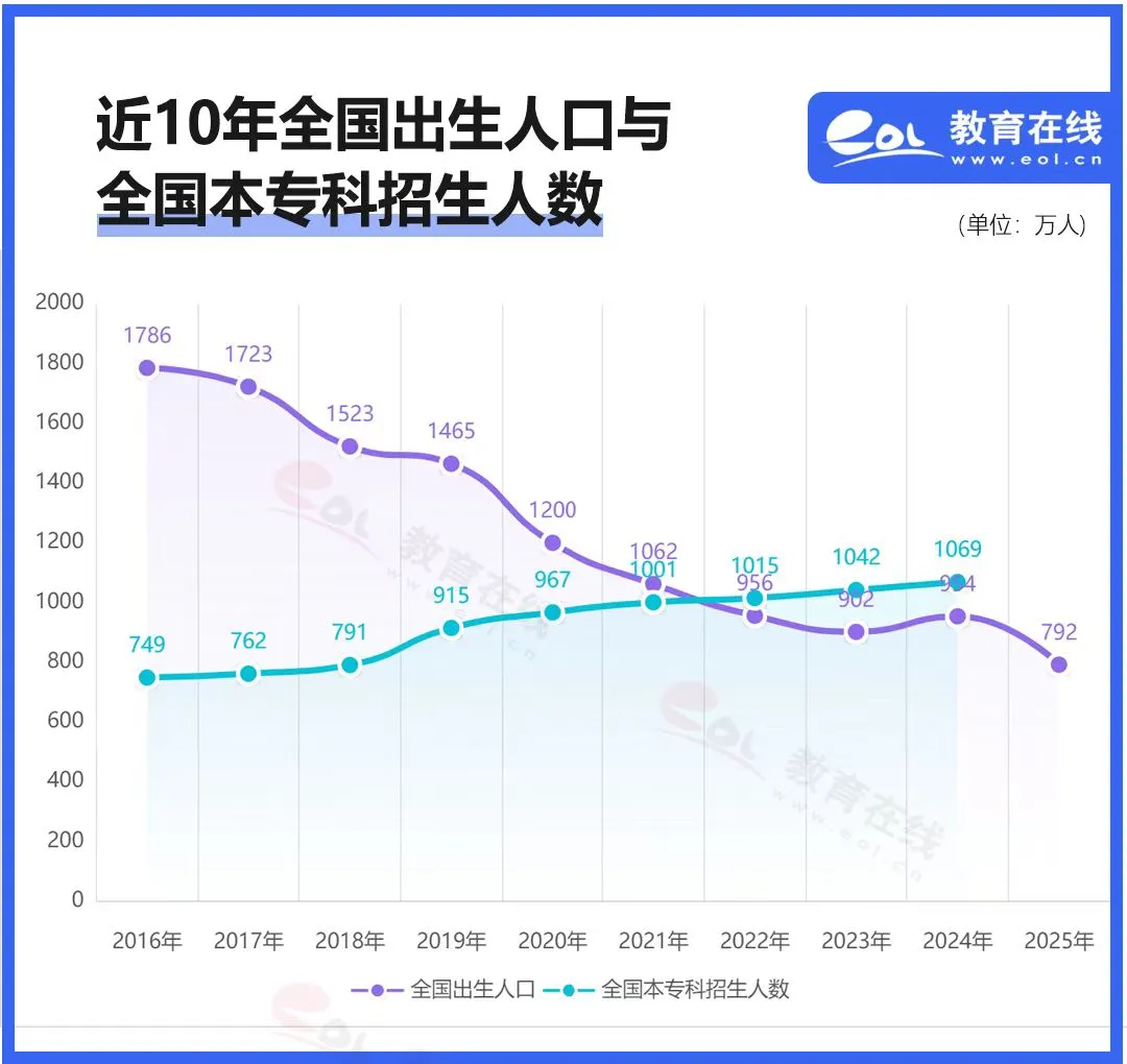 新生兒從2016年的1786萬快速下降至2025年的792萬,8年跌去56%。2024年全國高校招生1069萬,如果加上專升本,中職直升高職的人數(shù),則超過了1200萬。包括大學(xué)在內(nèi),未來教育資源必然顯著過剩,直白講,就是沒有生源了。這還是在二孩三孩政策不斷刺激下的結(jié)果。悲觀的人口專家比如梁建章估計,未來長期可能低于700萬。