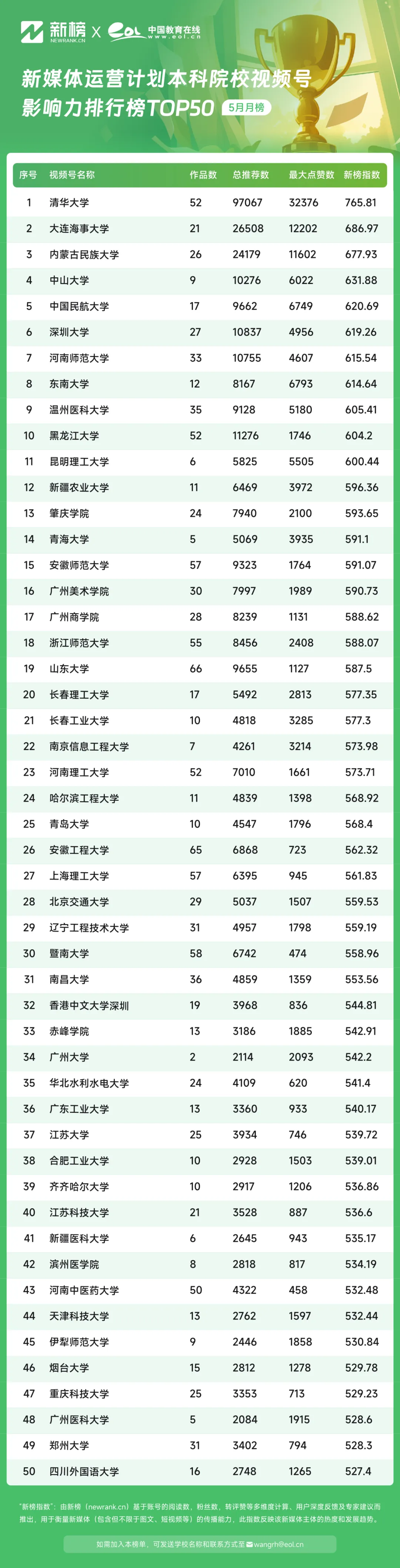 5月,中國教育在線新媒體運(yùn)營計劃本科院校微信視頻號影響力排行榜TOP50中,@清華大學(xué)視頻號憑借765.81的新榜指數(shù)躍居榜單第一,@大連海事大學(xué)憑借686.97的影響力指數(shù)位居第二,@內(nèi)蒙古民族大學(xué)以677.93的影響力指數(shù)位居榜單第三。