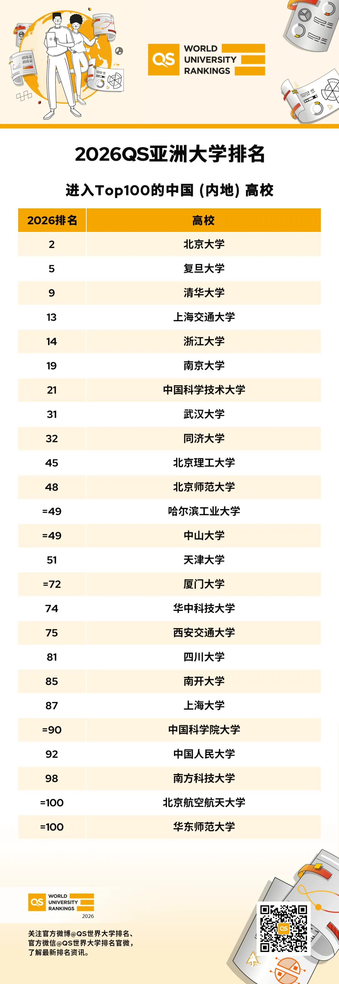 2026QS亞洲大學排名中國內地Top100高校如下: