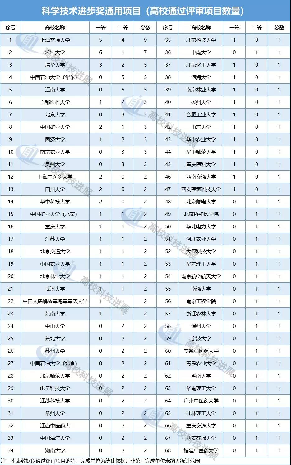 從科學(xué)技術(shù)進(jìn)步獎通用項(xiàng)目的會議評審結(jié)果來看,共有68所高校推薦項(xiàng)目通過評審,獲通過項(xiàng)目的高校數(shù)量與自然科學(xué)獎相差無幾。
