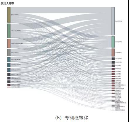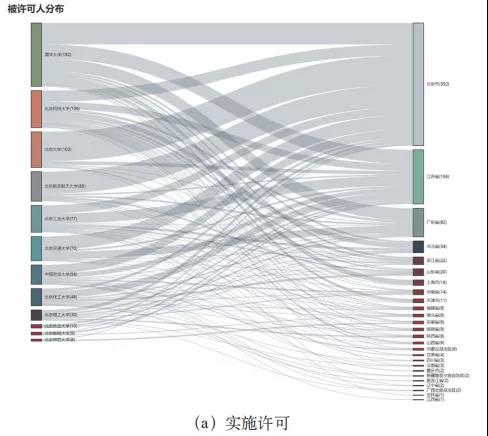 除北京外,江蘇、 廣東、河北、浙江、山東為北京“雙一流”高校許可專利的主要流向;轉(zhuǎn)讓專利主要流向為廣東、江蘇、 山東、天津、浙江。
