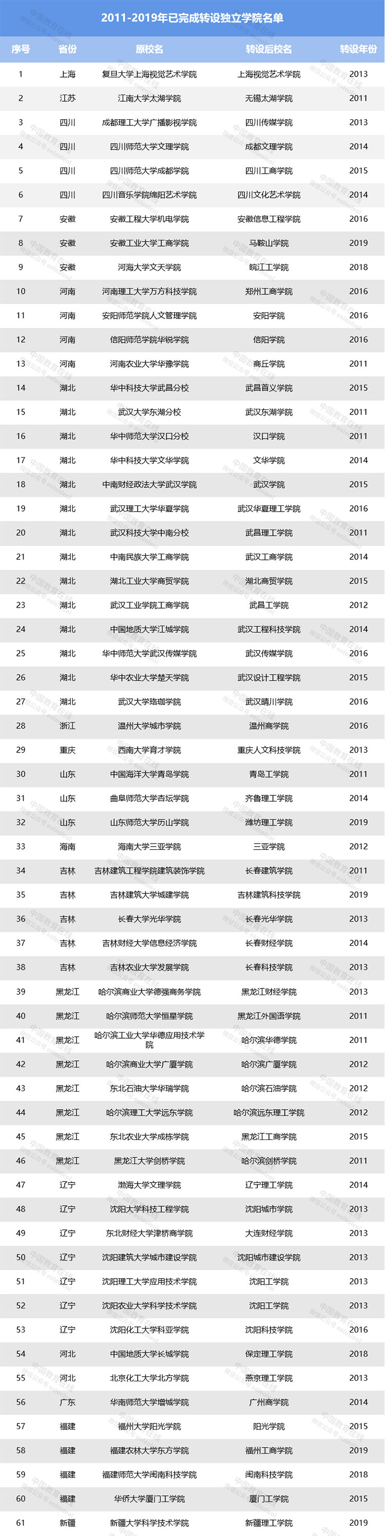 2020年5月,教育部辦公廳下發(fā)《關(guān)于加快推進(jìn)獨(dú)立學(xué)院轉(zhuǎn)設(shè)工作的實(shí)施方案》,提出到2020年末,各獨(dú)立學(xué)院全部制定轉(zhuǎn)設(shè)工作方案,并推動(dòng)一批獨(dú)立學(xué)院實(shí)現(xiàn)轉(zhuǎn)設(shè)。原則上,中央部屬高校、部省合作共建高校舉辦的獨(dú)立學(xué)院要率先完成轉(zhuǎn)設(shè),其他獨(dú)立學(xué)院要盡早完成轉(zhuǎn)設(shè)。