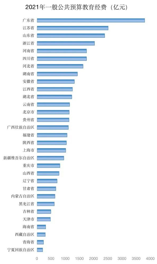 2021年廣東省一般公共預(yù)算教育經(jīng)費(fèi)高達(dá)3793.37億元,遙遙領(lǐng)先于其他省份。同年廣東省GDP總量達(dá)到12.44萬億元,連續(xù)33年居全國第一,廣東省作為全國首個(gè)也是唯一一個(gè)GDP跨上12萬億元臺階的省份,發(fā)達(dá)的經(jīng)濟(jì)足以支撐其較高的教育經(jīng)費(fèi)。