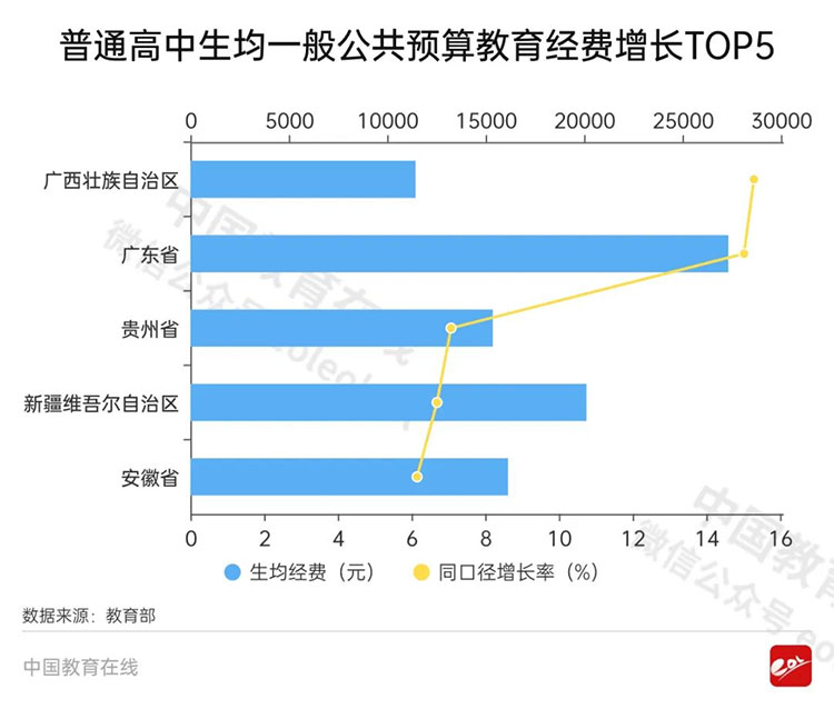 全國普通高中為18808.71元,同口徑比上年增長2.95%。各省區(qū)市中,增長最快的是廣西壯族自治區(qū)(15.29%)。其次為廣東省(15.02%)、貴州省(7.07%)、新疆維吾爾自治區(qū)(6.69%)、安徽省(6.15%)。