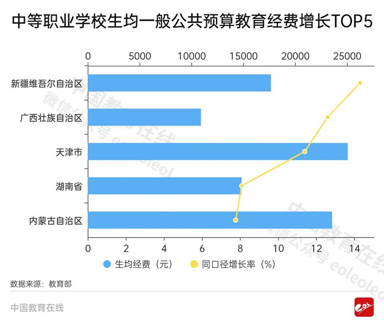 全國中等職業(yè)學(xué)校為17095.26元,同口徑比上年增長0.58%。各省區(qū)市中,增長最快的是新疆維吾爾自治區(qū)(14.31%)。其次為廣西壯族自治區(qū)(12.6%)、天津市(11.4%)、湖南省(8.09%)、內(nèi)蒙古自治區(qū)(7.77%)。
