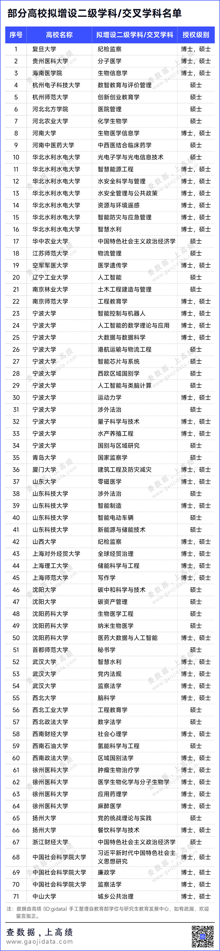 經(jīng)高績(ID:gjdata)不完全統(tǒng)計,目前已至少有40所高校擬增設(shè)二級學(xué)科或交叉學(xué)科,具體名單如下: