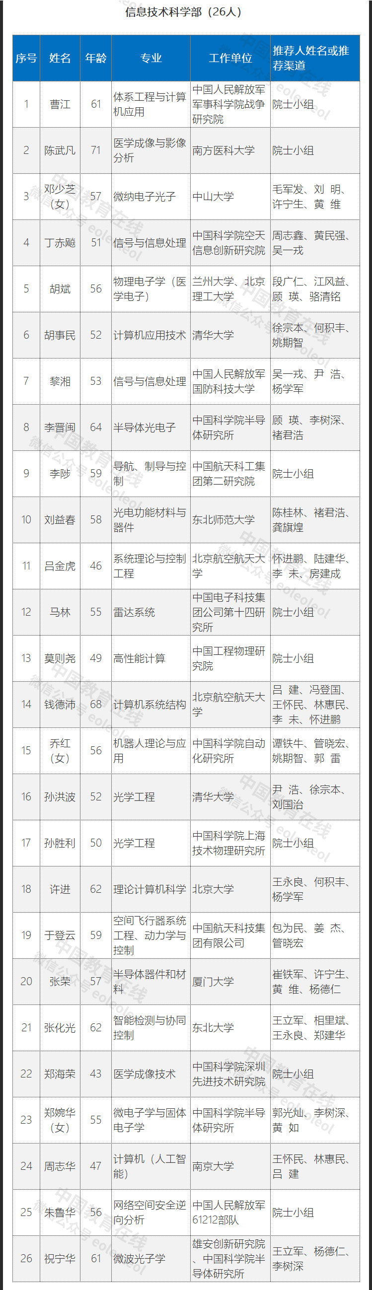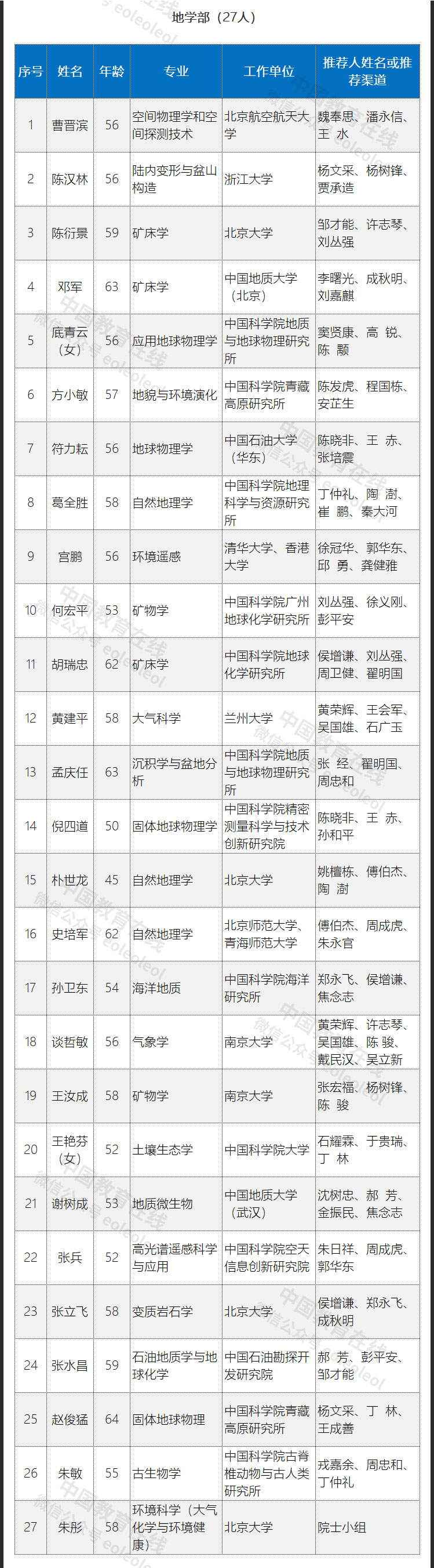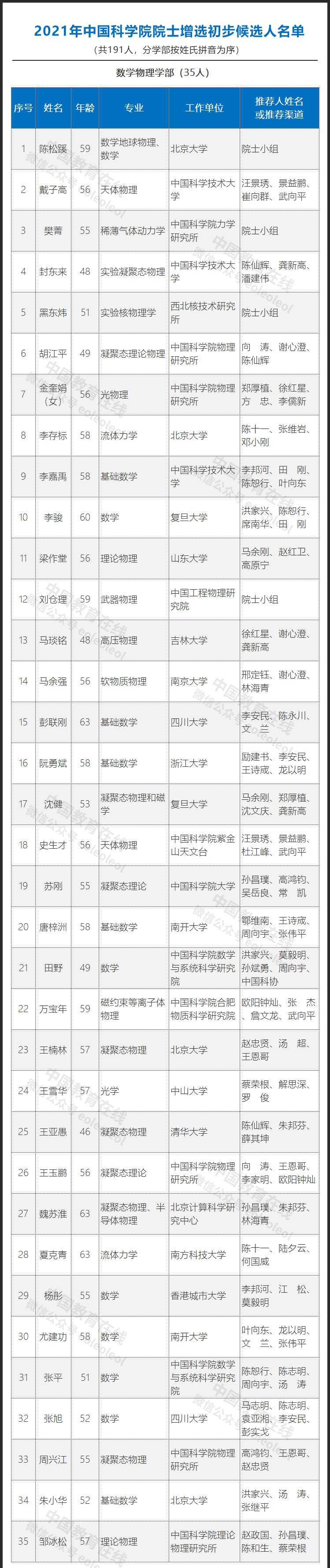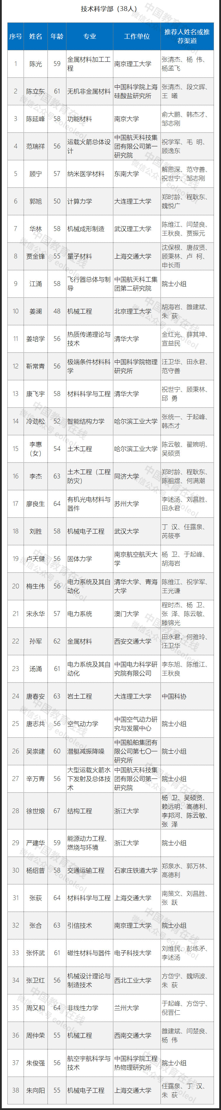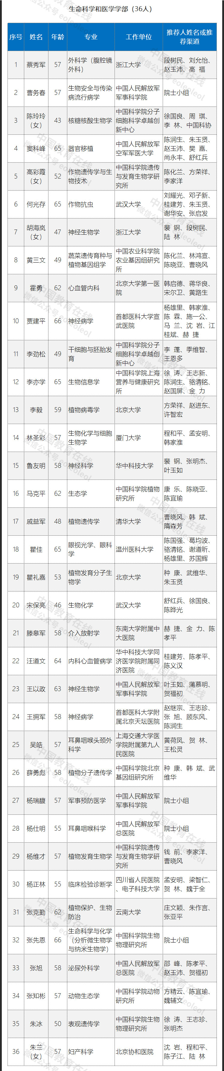 此次入圍的初步候選人共計191人,其中數(shù)學(xué)物理學(xué)部35人,化學(xué)部29人,生命科學(xué)和醫(yī)學(xué)學(xué)部36人,地學(xué)部27人,信息技術(shù)科學(xué)部26人,技術(shù)科學(xué)部38人。具體名單如下: