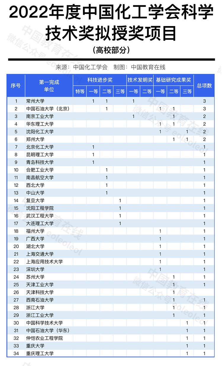 據(jù)統(tǒng)計(jì),此次共有34所高校以第一完成單位獲得2022年度中國(guó)化工學(xué)會(huì)科學(xué)技術(shù)獎(jiǎng),累計(jì)獲得42項(xiàng)獎(jiǎng)勵(lì)。