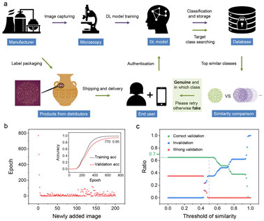 借助高通量的圖案化光刻(鏤空模板)、薄膜沉積以及一步熱退火技術(shù),可實(shí)現(xiàn)晶圓級(jí)PUF單元制作,體現(xiàn)了批量化、低成本(單個(gè)標(biāo)簽成本不到1美分)的制作特點(diǎn)。為了應(yīng)用到實(shí)際防偽場(chǎng)景,作者進(jìn)一步開發(fā)了一種基于深度學(xué)習(xí)算法的圖像PUF識(shí)別驗(yàn)證系統(tǒng),借助ResNet50分類神經(jīng)網(wǎng)絡(luò)模型對(duì)37000個(gè)PUF標(biāo)識(shí)符(10348)實(shí)現(xiàn)了可溯源、快速(6.36s)、高精度(0%假陽性)的驗(yàn)證,并提出了一種動(dòng)態(tài)數(shù)據(jù)庫策略,賦予深度學(xué)習(xí)模型極高的數(shù)據(jù)庫擴(kuò)容能力,理論上打破了龐大數(shù)據(jù)庫的建立與低訓(xùn)練時(shí)間成本難以兼容的技術(shù)瓶頸。