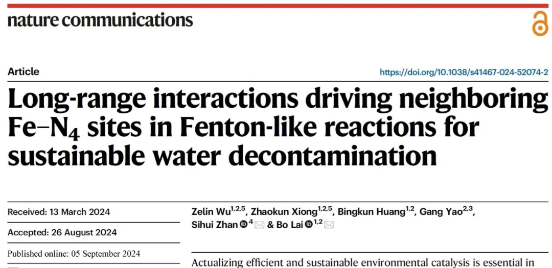 近日,四川大學(xué)建筑與環(huán)境學(xué)院賴波/熊兆錕團(tuán)隊(duì)在Nature Communications在線發(fā)表了題為“Long-range interactions driving neighboring Fe–N4sites in Fenton-like reactions for sustainable water decontamination”的研究論文。四川大學(xué)建筑與環(huán)境學(xué)院博士研究生吳澤林和熊兆錕副研究員為論文共同第一作者,四川大學(xué)賴波教授和南開大學(xué)展思輝教授為論文共同通訊作者。四川大學(xué)建筑與環(huán)境學(xué)院為論文第一和通訊作者單位。