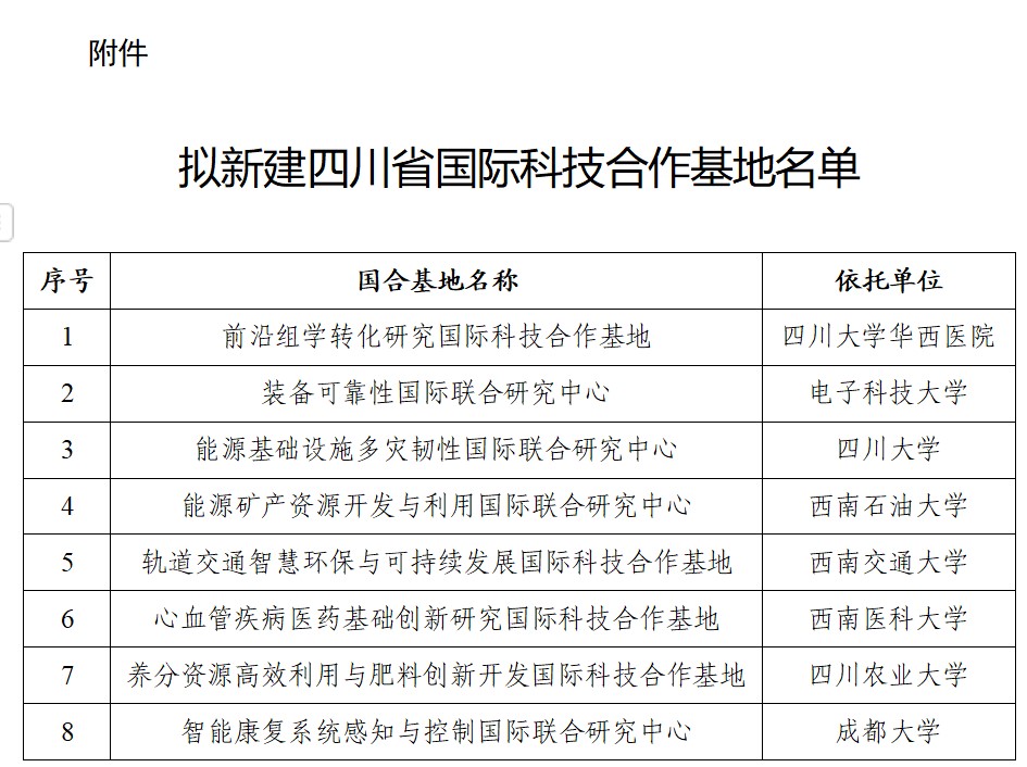 四川省科技廳公示擬新建國際科技合作基地名單