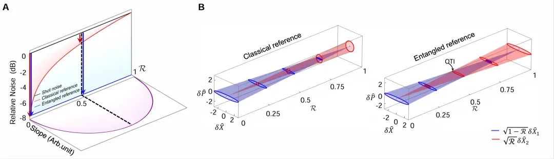 為突破此局限,團(tuán)隊(duì)構(gòu)建了互為糾纏的“量子孿生干涉儀”,取代現(xiàn)有的平衡零拍探測(cè)?;诓⑿信渲玫碾p對(duì)孿生糾纏光束,團(tuán)隊(duì)建立了量子關(guān)聯(lián)干涉與糾纏探測(cè)協(xié)同的相位測(cè)量新范式。這一成果成為量子計(jì)量學(xué)向前邁進(jìn)的又一里程碑。