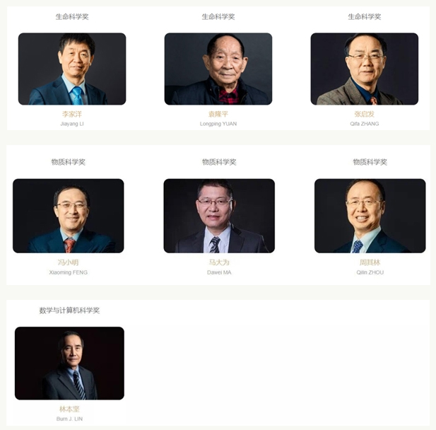 張亭棟、王振義獲得“生命科學(xué)獎(jiǎng)”;盧柯獲得“物質(zhì)科學(xué)獎(jiǎng)”;彭實(shí)戈獲得數(shù)學(xué)與計(jì)算機(jī)科學(xué)獎(jiǎng)。