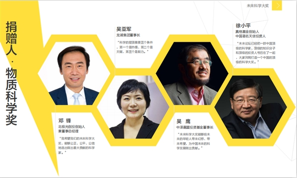 未來科學(xué)大獎(jiǎng)每個(gè)獎(jiǎng)項(xiàng)由4位捐贈(zèng)人共同捐贈(zèng),均為關(guān)注中國科技事業(yè)的企業(yè)家、投資人等自愿出資。