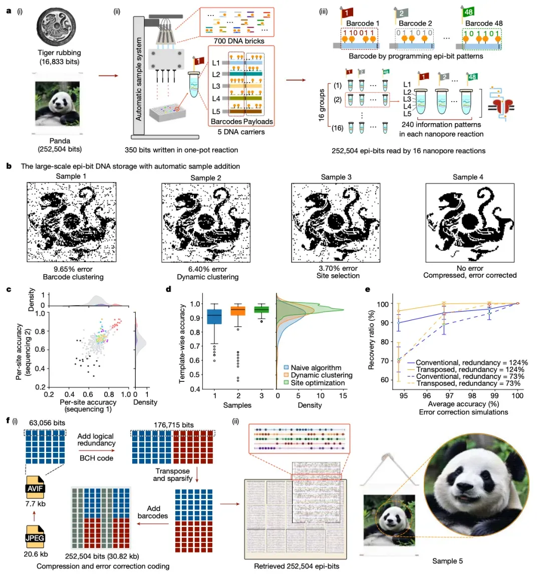 2024年10月23日,北京大學(xué)計算機學(xué)院張成與定量生物學(xué)中心錢瓏聯(lián)合研究團隊與合作者,在國際學(xué)術(shù)期刊Nature上發(fā)表題為“Parallel molecular data storage by printing epigenetic bits on DNA”的研究論文,首次提出了一種基于并行寫入策略的DNA存儲策略,成功將信息打印在DNA分子之上,猶如“活字印刷”,在白紙上批量印刷信息。團隊在實驗中,成功將中國漢代“白虎”瓦當(dāng)和大熊貓的高清圖片(數(shù)據(jù)量超過27.5萬比特)寫入DNA分子中,并無損還原了原始數(shù)據(jù),解析出高清圖片。