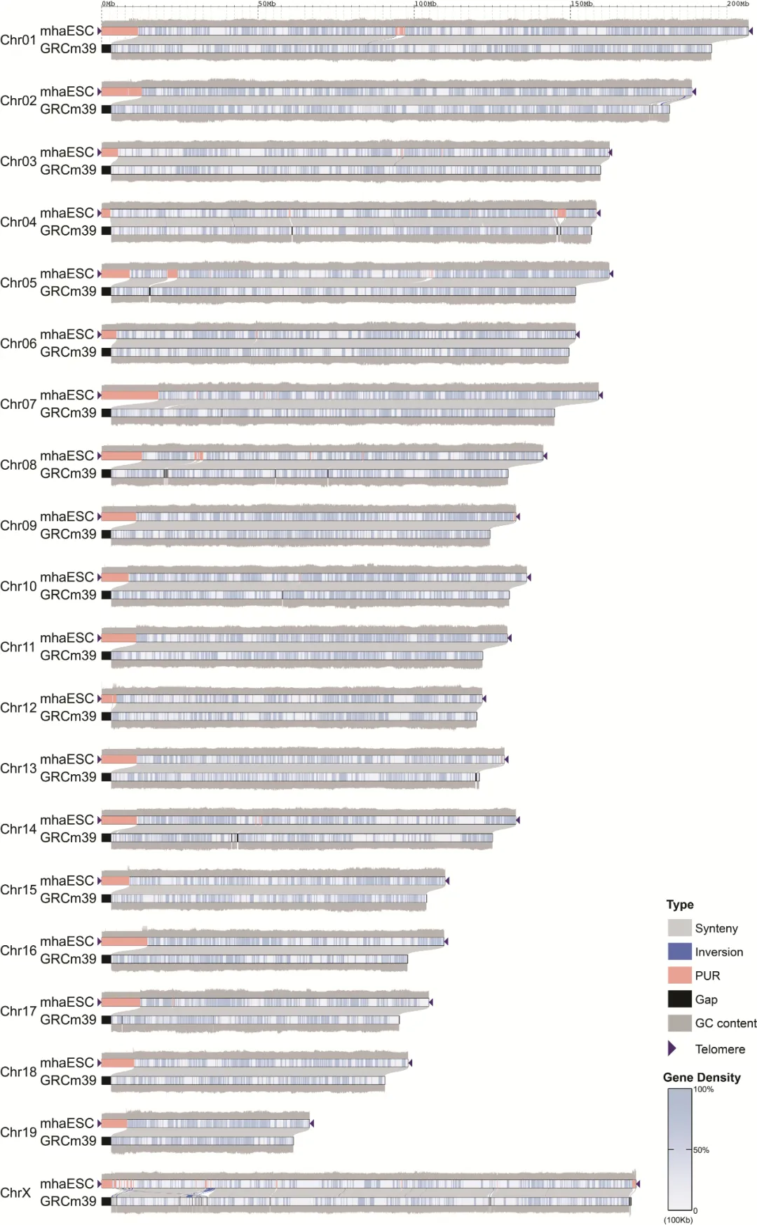 俞曉春團(tuán)隊(duì)綜合了眾多三代基因測序技術(shù),讓它們互相補(bǔ)足,開發(fā)了一把能夠充分挖掘小鼠基因的“金鏟子”。他們以最常用的小鼠C57BL/6的單倍體胚胎干細(xì)胞(mhaESC)為樣本,進(jìn)行了基因測序和組裝,獲得了長度為2.77 Gbp(表示十億個(gè)堿基對)的完整的高質(zhì)量小鼠參考基因組序列,其中包含215.23 Mbp(表示一百萬個(gè)堿基對)先前未被鑒定的序列,填補(bǔ)了約7.7%的基因組空白。