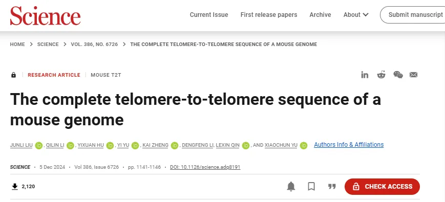 12月6日,《科學(xué)》(Science)雜志在線發(fā)表了西湖大學(xué)生命科學(xué)學(xué)院、西湖實(shí)驗(yàn)室俞曉春團(tuán)隊(duì)最新成果“完整的端粒到端粒小鼠參考基因組序列(The complete telomere-to-telomere sequence of a mouse genome)”,報(bào)道了該團(tuán)隊(duì)在解析小鼠參考基因組方面取得的重要突破。這意味著人類歷史上第一次看清小鼠基因組DNA全貌。