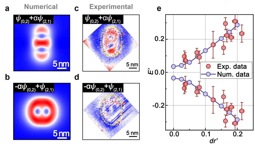 該研究指出,如果在石墨烯量子點中將圓形勢場變形為橢圓形勢場,軌道量子數(shù)為0的s軌道和軌道量子數(shù)為2的d軌道之間將會發(fā)生雜化,重新組合成兩個新的雜化態(tài)。孫慶豐教授課題組從解析推導和數(shù)值計算兩方面得到了雜化態(tài)的形狀(圖2a,b,θ形和倒θ形)。何林教授課題組在實驗上利用掃描隧道顯微鏡(STM)針尖操縱技術,開發(fā)了制備具有不同各向異性程度量子點的方法,并對其中的受限態(tài)進行了系統(tǒng)探測,直接觀測到了量子點受限態(tài)的軌道雜化特征(圖2c,d)。