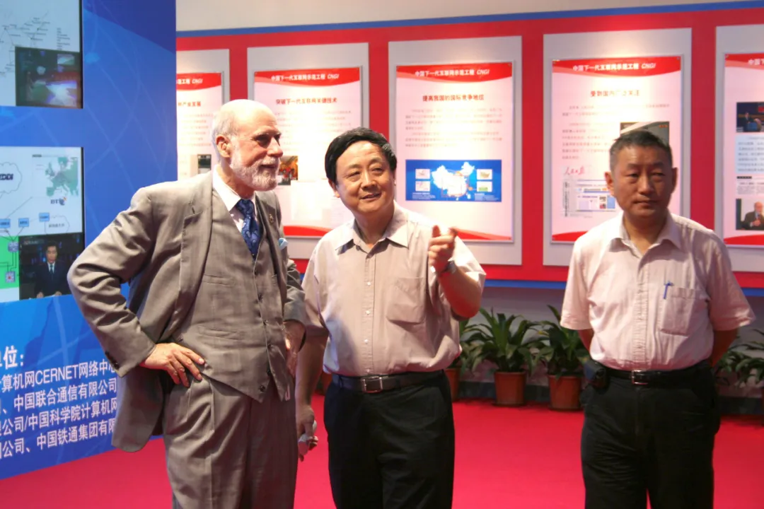 溫頓·瑟夫(左)曾多次訪問清華大學并與校內(nèi)專家交流互聯(lián)網(wǎng)技術(shù),這是他訪問期間和吳建平(中)、李星(右)在一起